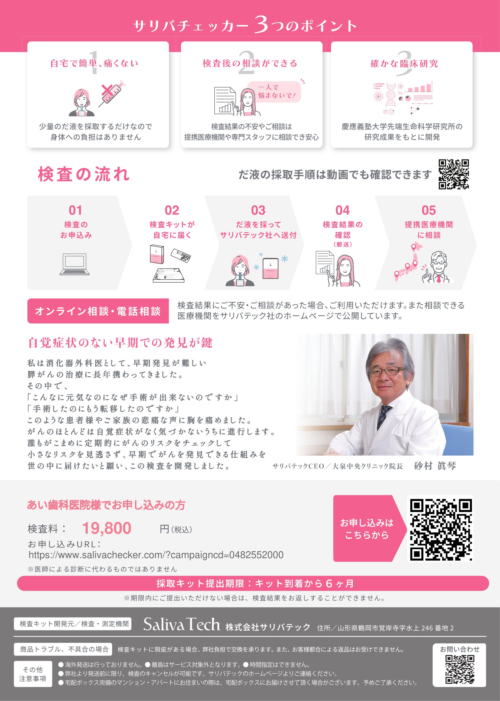 当院では、唾液でがんのリスクを調べる検査「サリバチェッカー」を導入しました。サリバチェッカーは、慶應義塾大学先端生命科学研究所の研究成果をもとに開発されたAI(人工知能)による新しいがんリスク検査です。数滴のだ液を専用キットに採取するだけで行えるため、採血のような痛みや身体への負担がなく、ご自宅で簡単に検査できるのが特長です。